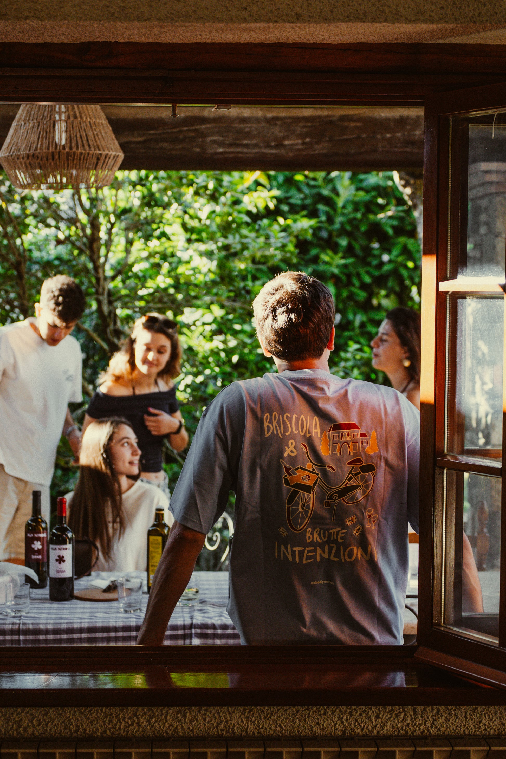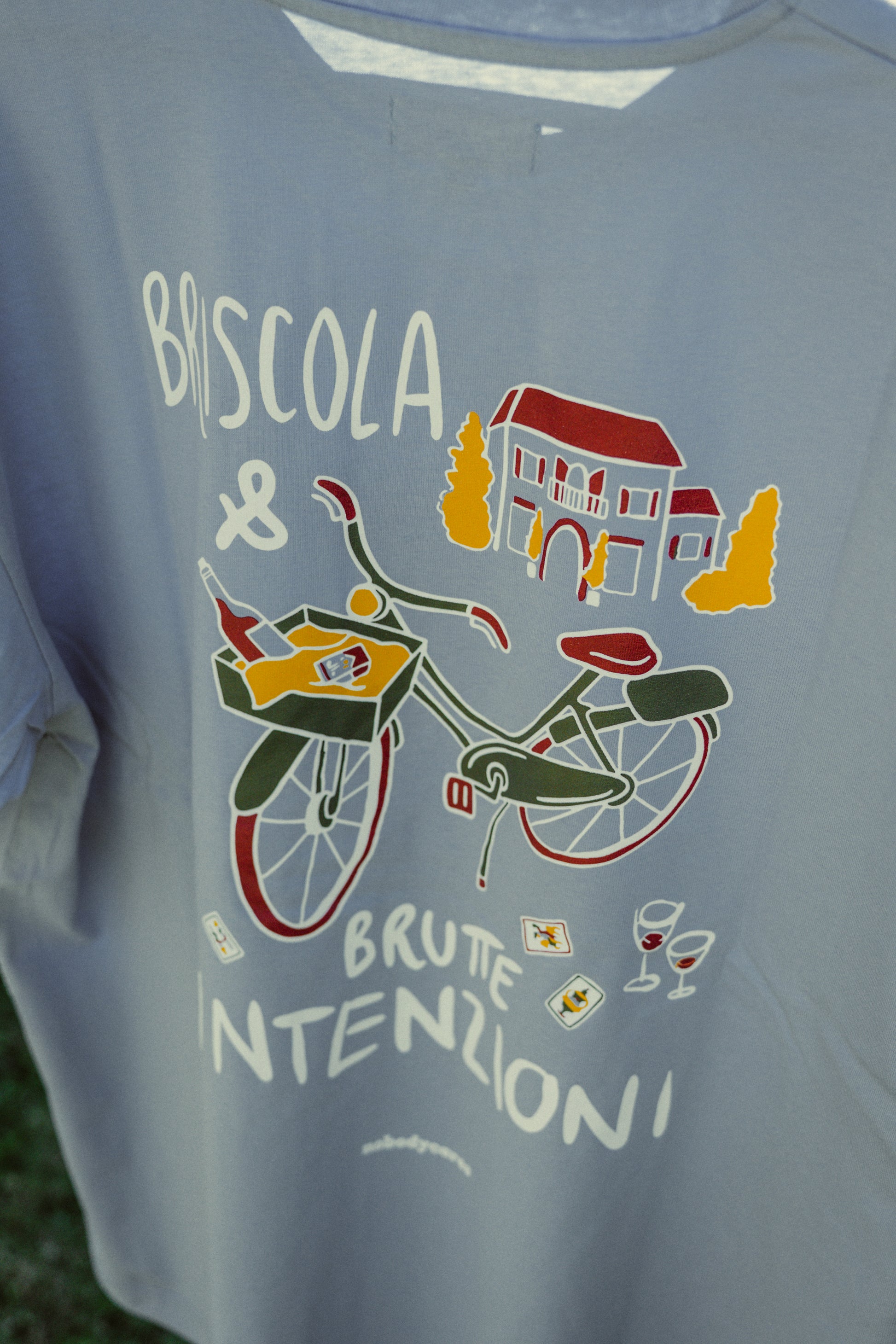 Retro: scritta "briscola & brutte intenzioni" + elementi simbolici